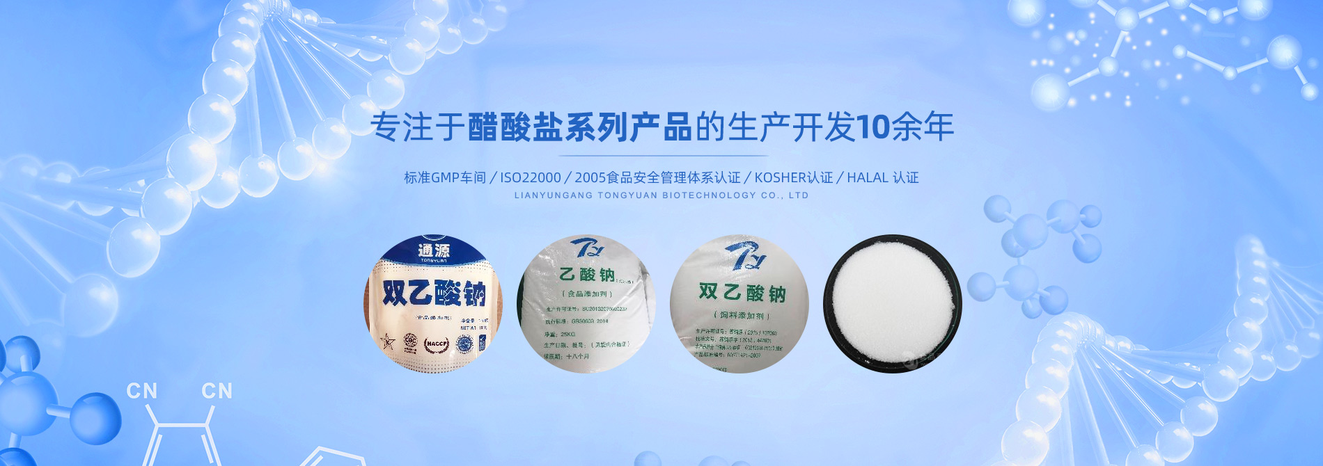 連云港市通源生物科技有限公司 是生產(chǎn)雙乙酸鈉、無水醋酸鈉、三水醋酸鈉、醋酸鉀、乙酸鈉、丙酸鈉、丙酸鈣和氯化鉀等系類醋酸鹽產(chǎn)品的專業(yè)制造商。公司專注于醋酸鹽系列產(chǎn)品的生產(chǎn)開發(fā)10余年,是國內(nèi)專業(yè)醋酸酸鹽產(chǎn)品生產(chǎn)基地。 目前,我們已和全球30多個國家和地區(qū)建立長期的業(yè)務(wù)合作關(guān)系,是中國較大的雙乙酸鈉生產(chǎn)商和出口商之一。作為中國食品添加劑和配料協(xié)會理事單位,通源公司已建成標(biāo)準(zhǔn)GMP車間5000余平方米,通過了ISO22000:2005食品安全管理體系認證、KOSHER認證、HALAL 認證等,這些都是我們提供高質(zhì)量產(chǎn)品和優(yōu)良服務(wù)的前提和確保。 生產(chǎn)出色產(chǎn)品,提供優(yōu)良服務(wù),滿足顧客需要,是我們努力的目標(biāo)。愿和我們的朋友們攜手,共...